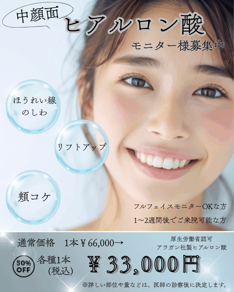 ヒアルロン酸注入とは、ヒアルロン酸を肌に注入することで、しわやたるみ、凹みなどを改善する美容治療です。ヒアルロン酸は体内にも存在する保湿成分で、肌のハリや潤いを維持してくれます。
