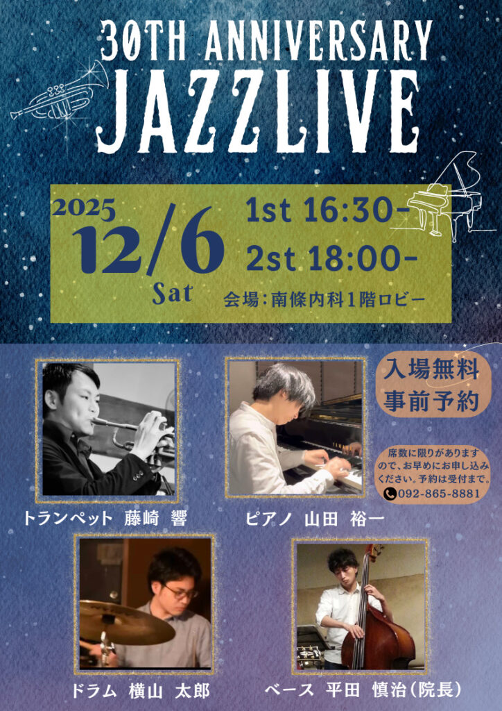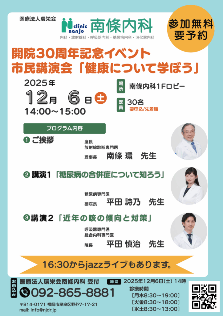 2025年12月で南條内科が開院30周年になります。皆様に感謝の気持を込めて30周年記念イベントを行います。理事長あいさつ・糖尿病専門医・呼吸器専門医による講演会、JAZZライブがあります。みなさまのご参加をお待ちしています。